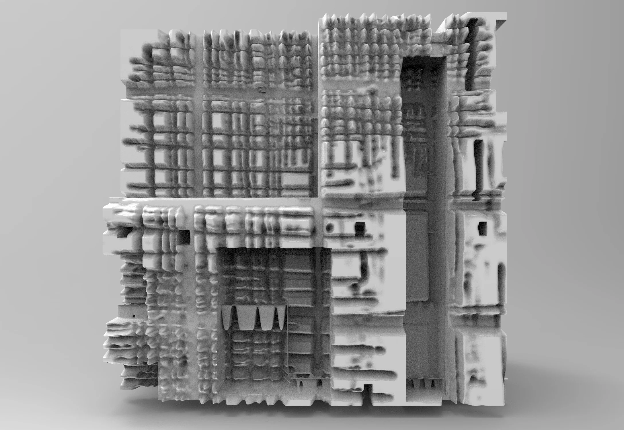 Textures like paper, clay, and canvas have different visual characteristics like density, dullness, and grain. Photos of each material were bashed to generate images that came closer to the ambiguous notion of unverticality in my mind. The sense of tunneling in the paper image, the excess striation of the clay bash, and the stippling of the canvas bash came through in the final worlds.