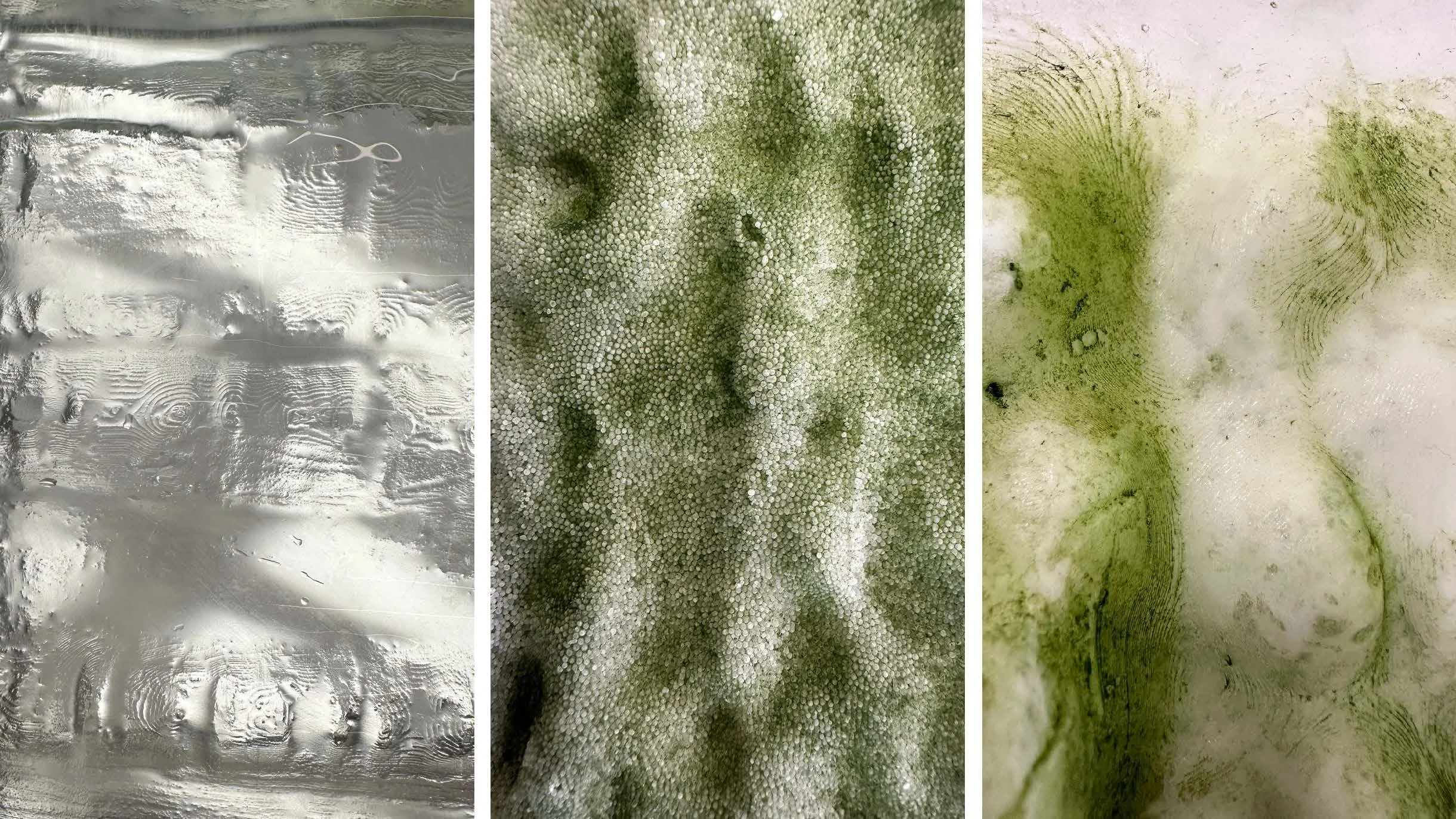 glass material palette from left to right; slumped recycled float glass sheet, sintered recycled beaded glass, foamed glass powder using foaming agents